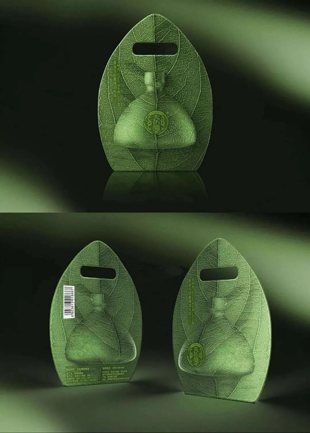 上面这个是天佑德酒的包装。天佑德酒业是中国青海省的著名品牌。公司以生态酿造为品牌核心文化。产品设计采用仿生方式设计,以“一片叶子”为造型。一目了然,使消费者清楚地知道这是用生态无污染原料酿造的高地大麦酒。包装材料采用可降解的纸浆脱模工艺,从而节省了成本,空间并避免了过度包装。这样沁人心脾的酒包也只能用纸浆模塑制品来完成了。